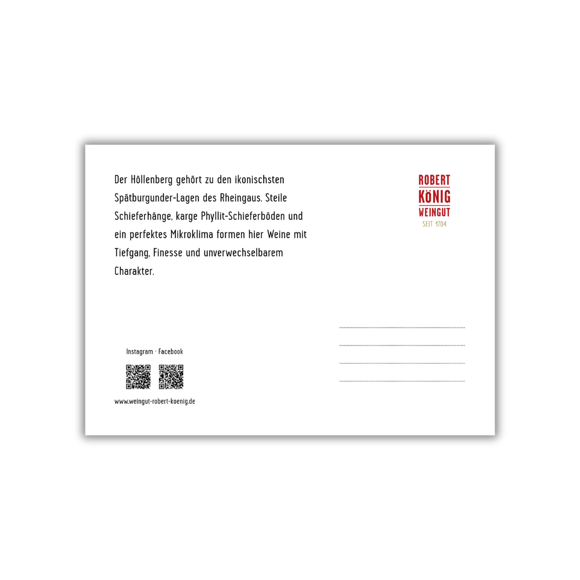 Die Vorderseite besticht durch eine eindrucksvolle Landschaftsaufnahme der Weinberge. Auf der Rückseite findet sich eine elegante Beschreibung des Höllenbergs, sowie Platz für persönliche Grüße und die Empfängeradresse.